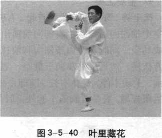 接上势。左掌屈肘向 右臂窝侧掩扣。右掌直臂 向前穿出,并向上托起,使 双掌由上向内、向下翻扣, 划圆。同时右腿随两掌向 内翻扣挺膝伸直弹点,脚 尖内扣。动作要点、攻防 方法与第一趟“叶里藏花” (9)相同(图 3-5-40)。