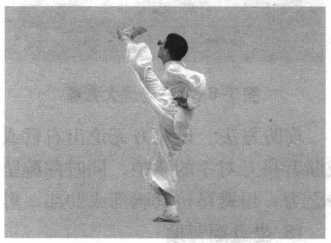 同时左腿勾脚尖随右掌外挂撑起向迎