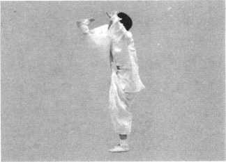接上势。左脚落地,随即右掌下划回收于右腰间。左掌自腰向 胸前扣劈,划弧形,然后向左外上方挂挑,停于左额斜上方。同
