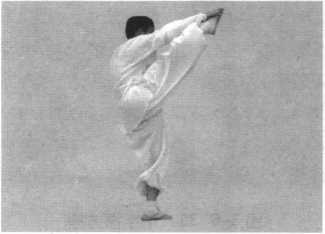 攻防方法:我先以左臂向前扒扣下压对方正面进攻之臂,同 时上左步迅速以右腿向上 弹点其下颗或胸口部。