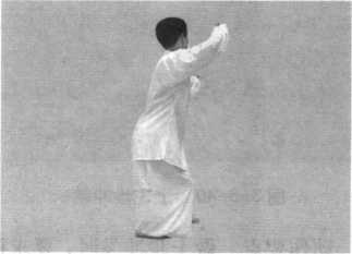 接上势。右脚落下,随 即左腿向前迈出,落脚以 前脚掌着地,成左虚步。同 时两掌变拳,右拳上挑外 撑架起,划弧形,停于右