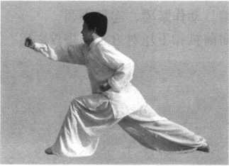 图3-6-40 上左步冲拳图3-6-40 上左步冲拳接上势。以腰带身向 右拧,随即左脚向前上步, 落脚左膝前弓,成左弓步。 同时左拳屈肘向胸前扒 扣,拳心朝下,右拳由腰 侧随左弓步经左拳背上直 臂向前打出,拳高与肩平, 拳眼朝上。左拳回收于左 腰间,拳心朝上。目视右 拳(图 3-6-40)。