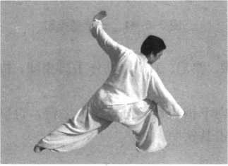 接上势。身体由右弓步向左旋转180。,随之右腿向左侧上步, 落脚迅速蹬地起跳,身体腾空而起,到最高水平时,身体于空中 继续向左旋转一周,同时以左腿先做外摆,右腿借身体旋转之力,