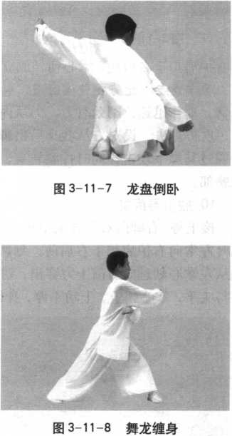 接上势。身体由倒插 坐盘势直起迅速向左旋转 180°,同时左拳屈肘向右 腋下插,并向上挑起,划 弧形。右拳向左肩上方拨 挑缠身绕圈一周后,再继 续下划向腰侧回收。上动 不停,右腿绷,左膝前弓 成左弓步。同时左拳自胸 经左膝前向外搂出,划弧形,然后回收于左腰间。右拳自腰随左 弓步直臂向前冲出。动作要点、攻防方法与第九趟“舞龙缠身”(9) 相同(图3-11—8)。