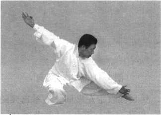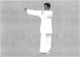 动作要点:此势要身体挺直,双腿并拢,挺膝、直腰、错肩、 直臂。动作迅速,刚劲有力,力从内发,协调一致。