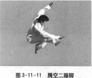 接上势。身体直起,左掌回收于左腰间,右掌向右外劈下。同 时右脚向前上步,迅速蹬地起跳,左膝高提,身体腾空而起,到 最高水平时,右腿于空中挺膝伸直向前上方弹点,脚面绷平,左 腿向下摆,在空中以左掌心与右掌背相击,双掌心朝下,然后左 掌向左外展撑肘分开,并迅速以右掌心拍击右脚面。目视右掌右 脚(图 3-11-11)。