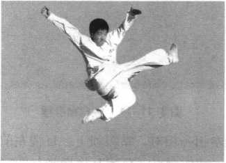 攻防方法:我先以两 臂硬攻直进猛然攻击对 方。设对手不胜而转身败 走,我身体腾空跃起追赶,