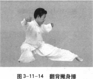 出,随即左脚向前上步,身 体向右旋转180°。同时左 拳内旋翻腕向前翻砸,右 拳随左脚上步向右外翻 劈。右腿向后撤步,落脚 双膝下蹲成虎佗步。同时 右拳随体转自右下划成弧 形,撑于右肋外侧前方,左 拳随右臂外展内扣。然后 两臂随成虎佗步向左右两 侧内旋外展撇开,呈弧形, 两拳相齐相对,拳眼朝上。目视左前方(图3-11-14)。