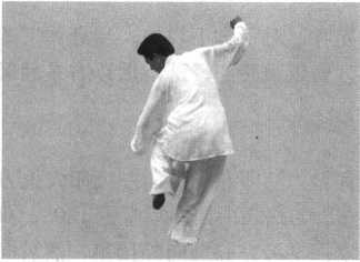 接上势。左脚向前上 步,落脚成三角形,身体向 右旋转180°,随即右腿勾 脚尖向左上方迎面踢起, 然后以腰带右腿向右摆 图3_11 _29斜步十字振方捶 踢,走横线,落脚右膝前