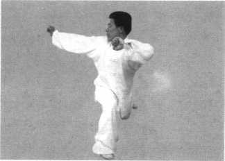 动作要点:右脚上步 与两臂旋摆云绕圈打要配 合身体向左翻转同时运 行。动作迅速,一动即快, 一快齐快。