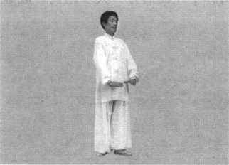 接上势。身体由马步直起向左拧,随之左脚向后撤步,落脚于 右腿内侧中间,以前脚掌着地,成立正十字丁步。同时两拳变掌,