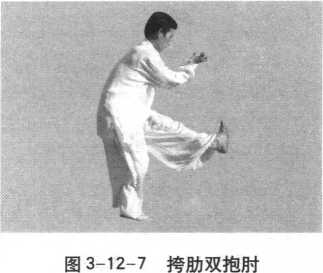 接上势。身体向左转90°,随即左腿挺膝向上踢起,脚尖勾起, 重心落于右腿支撑。同时两臂外展挎肋翻腕抱肘于胸前,两拳拳 尾相对,拳心朝内,高与胸平。目视前方(图3-12-7)。