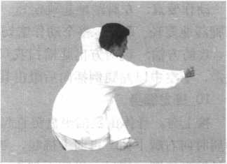 动作要点:左脚落步疾速,双腿屈膝下蹲成坐盘势要快、要 稳,右臂打出有力,动作迅速,气沉丹田贯于全身,内外协调一致。
