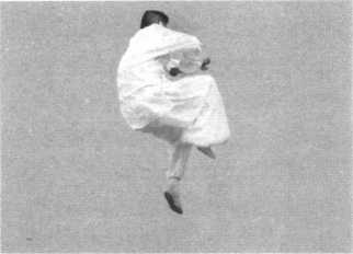 攻防方法:设对方出腿横扫我双腿。我双脚跃起躲过其腿下 攻击,于空中以左腿倒插向后蹬击其膝关节或小腿胫骨部。