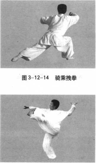 心朝下。目视左前方(3-12-14)。图3-12-15双拢蹬吊拦动作要点:右脚落步 与两臂旋摆翻绕拽拉要配 合身法同时运动。要求挺 胸、直腰、顺肩、展背。动 作两臂灵活,刚柔相济,劲 发于内,达于臂。