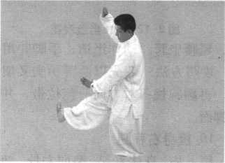 动作要点:左脚高吊蹬拦与两臂云摆拢抄要配合身体直起同 时运行。整个动作全身放松,协调一致。