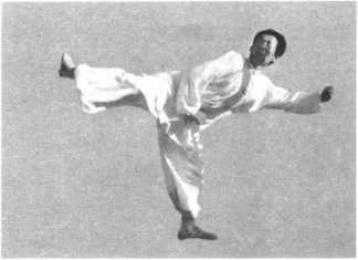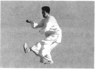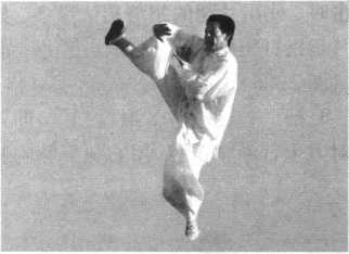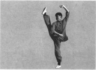 13. 跺跺腿拳称“飞 云跺子腿”。是指一腿向前 勾踢对方裆部、胫骨、膝盖 以及腹、腰、胯等部位。随 即落步震脚,并迅速向前跃 起,勾脚尖蹬踢对方胸部或 面部。套路动作和技击使用 屮的朝天蹬、挂步单排脚、 金鸡蹬腿等,都为跺子腿内 容。目随腿行(图2-31)。