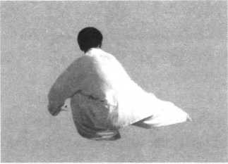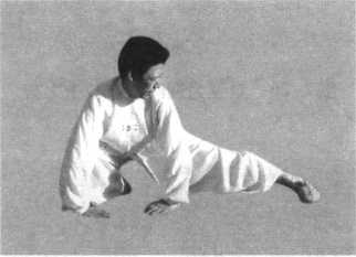 图2-27挺膝勾尖向前横扫前脚掌擦地,双手扶地。套 路动作或技击使用中,可 变化出勾挂连环腿、勾戳 丁步、兜裆腿等。目随腿 行(图 2—27)。