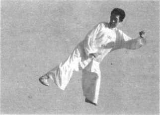 使用时,蹬腿的着力点可 勾踢对方兜裆、小腿胫骨、 膝盖。还可以蹬胸、腹、腰、 胯等部位。套路或技击中 的蹬法有:十字蹬腿、跃 步十字蹬腿、朝天蹬、右 提蹬子腿、穿枪脚等。目 随腿行(图2-29)。