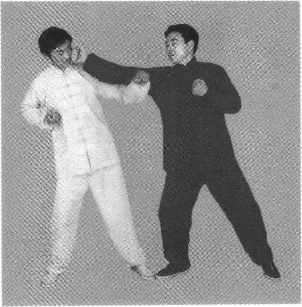 此招是崩拳与 砸拳的连击法,两 拳衔接对敌面门重 位,不断地加以攻 击,崩拳中短直 发,砸拳弧线长 打,变换顺溜,操 纵灵便。