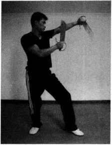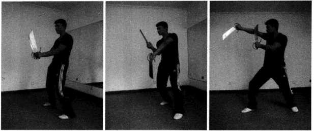依循上式王师傅右脚迅速向正前方圈步进马成侧身前进马姿势,同时右腕翻转令右手刀刀刃向上弧线向右侧前上方撩出刀刃斜