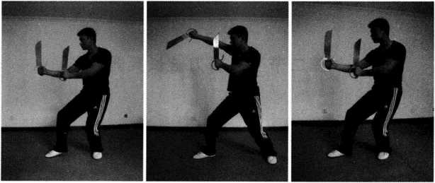 (注本路问手刀运行之际向右侧面共做出三次问手刀同时做出三次虚步坐刀而左侧面问手刀仅做一次。)