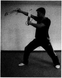 依循上式王师傅向左转马转体45。角以侧身马姿势出刀右手刀尖朝上左手刀尖朝下双刀成一字状置于体前刀刃朝外(图030)此之谓左转马一字刀二