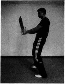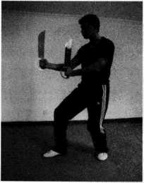 依循上式王师傅右脚迅速回收身体重心落于左腿之上成侧身左脚实、右脚虚点地状同时落臂沉腕双刀一前一后立起置于体前中线位置(图032)。
