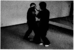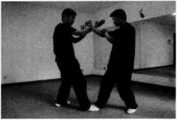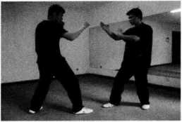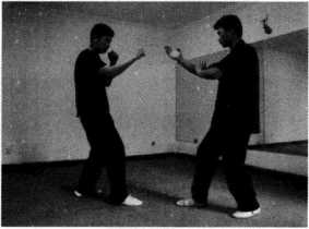 (1)王师傅右腿在前以正身前进马姿势站立右手问手迎敌对手以右侧身格斗式站立作势挥拳欲攻王师傅(图249)。