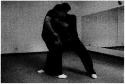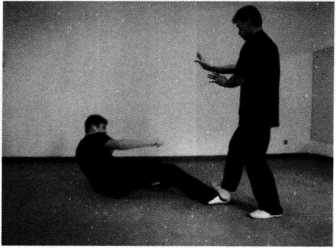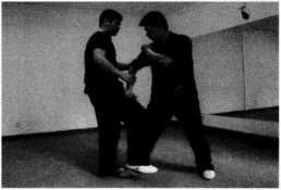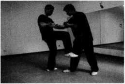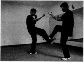 (2)对手突然起右脚蹬踢王师傅前腿王师傅右脚迅速抬起以斜撑腿截击对手右腿胫骨(图245)。
