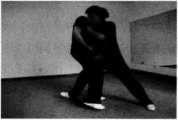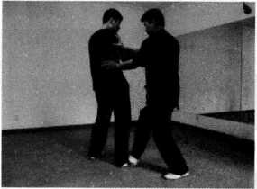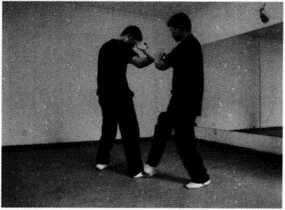 (1)王师傅右腿在前以正身前进马姿势站立右手问手迎敌对手以右侧身格斗式站立作势挥拳欲攻王师傅(图244)。