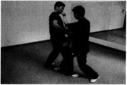 (3)顷刻王师傅右脚蹬踏落步将对手右脚踩于脚底对手立刻挥右拳反击王师傅问手之力发出封住其右臂(图246)。