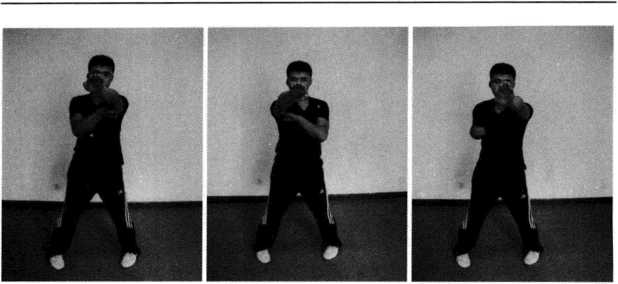 依循上式左肘底发力由正身马向前上方发出左手标指左臂标尽之时右拳变标指置于左肘底五指向前随即右手迅速自下而上,向前上方标出右臂标尽之时左标指手同时回到右肘底五指向前动作不停左手迅速自下而上向前上方标出左臂标尽之时右标指手变拳回拉至右胸侧此之谓正身标指三式。作用锻炼标指连环穿打技术强化手臂弹抖力、腕力与指力。图244 图245 图246