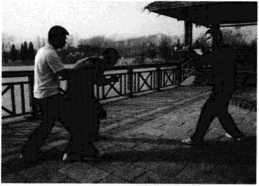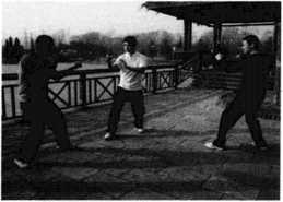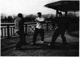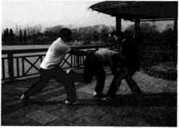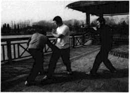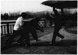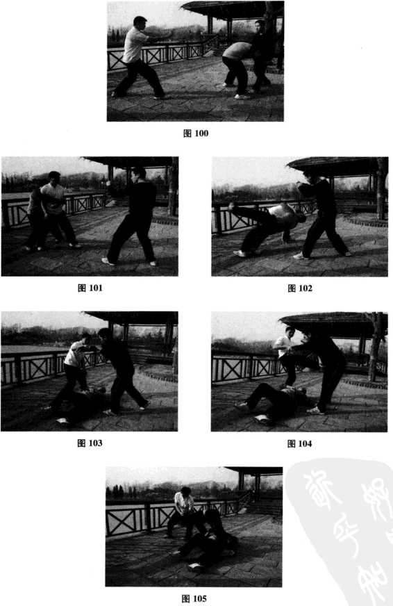 (4)随即王师傅右腿向后方回落沉腰坐马发力右手沉肘回带,带动高个子歹徒向前冲身摔倒摔在矮个子歹徒身上进而王师傅拳头如雨点般落在其头部、后背之上(图105)此之谓捉手制敌之法。