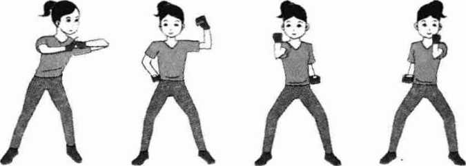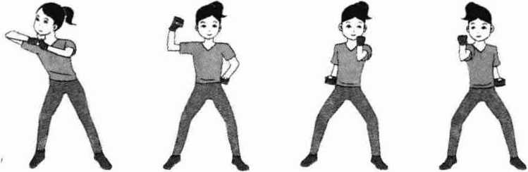 1动作方法(刃图5-1-4)(1) 第一个八拍右肘击加右格挡左横劈加右横劈(2) 第二个八拍动作相同方向相反(3) 第三至四个八拍正向、反向各重复1次。2技术要点本节动作较为综合主要锻炼胸、背部的肌肉使之更结实让全身充满活力。图5—1—4图5—1—4图5—1—4图5—1—4项五、第五节)1动作方法(鬼图5-1-5)(1) 出左直拳虚出左直拳虚第一个八拍右下格挡接右弓步,步右上格挡然后防守站立出左直拳虚出左直拳虚(2) 第二个八拍动作相同方向相反(3) 第三至四个八拍正向、反向各重复1次。