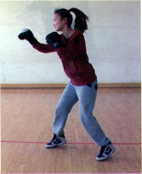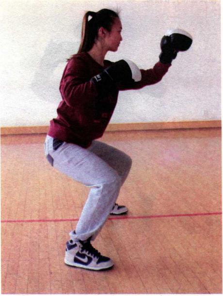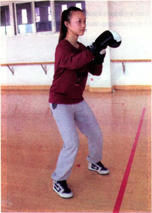 在前后开立的基础上双拳防守位置升高护住头部同时下蹲。