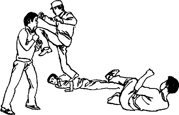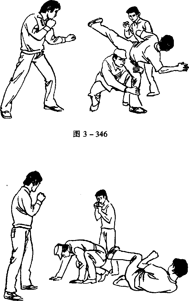 反击方法当正面有一名敌人踹击我头部攻击两侧又有两名敌人挥拳欲攻时(图3-345)迅速潜避并上左步抱敌之右支撑腿后拉、肩前顶将之摔出(图3-346)紧接着顺势右后转身用右后扫腿猛扫左侧敌之小腿下端使之倒地(图3-347)此时右侧之敌已上步冲来我则左脚用力蹬地跳起并用左冲膝猛力撞击其面部(图3-348)。图3-348动作要点反应快动作敏捷潜闪抱腿及时顶摔有力右后扫腿迅猛全身协调用力抱腿前顶与后扫腿要快速连贯一气呵成飞膝撞面要狠、准。