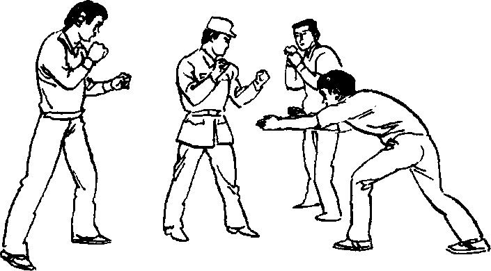 反击方法当正面有一名敌人突然上步蹲身欲抱我腿两侧又有两名敌人欲攻击我时(图3-349)迅速用右正弹腿猛力弹