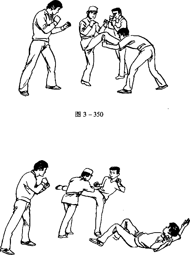 踢正面之敌面部(图3-350)此时左侧之敌用右侧弹腿踢击我腹部我快速用左手抄抱其腿(图3-351),随即左手上抬用右