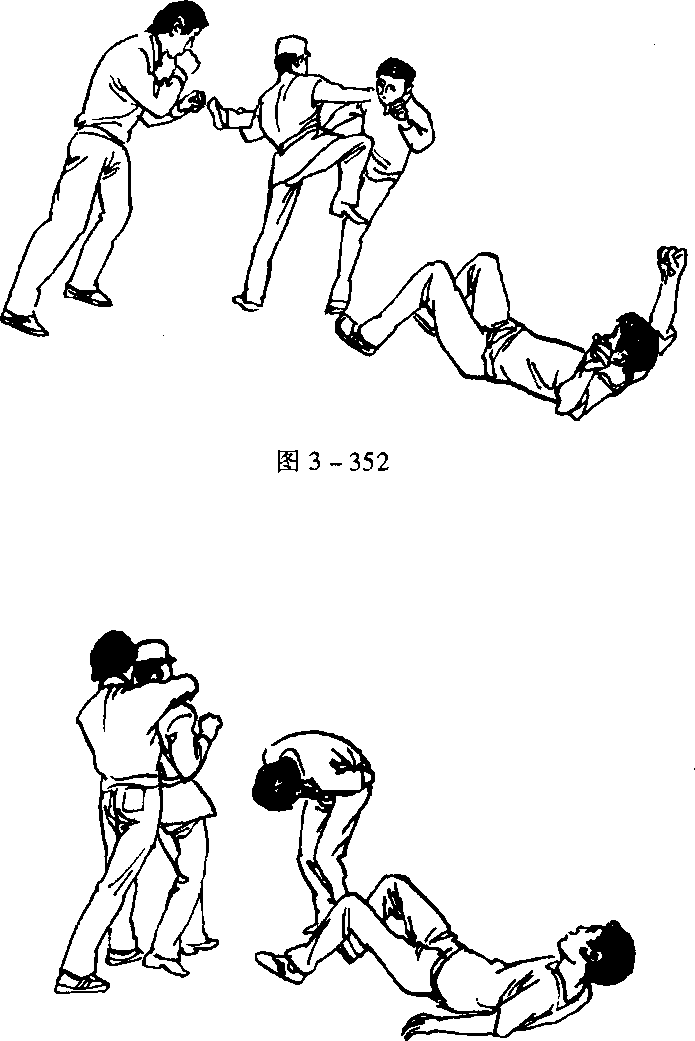 侧撞膝反击其腹肋部(图3-352)而右侧之敌已冲来并从背后