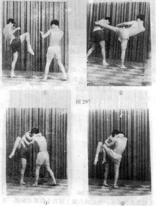 1双方已接近对方抢内夹我头颈用右摆膝撞我左肋。我用左膝撞击对方右大腿内侧(见图29812)。或左膝前冲顶撞对方右侧下腹。