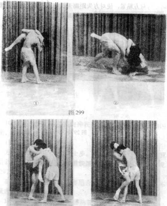 对方贴紧使对方失距而无法施膝撞击此时抱腰上乩使对方悬空,然后向侧摔倒对方(见图29912)。