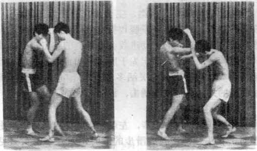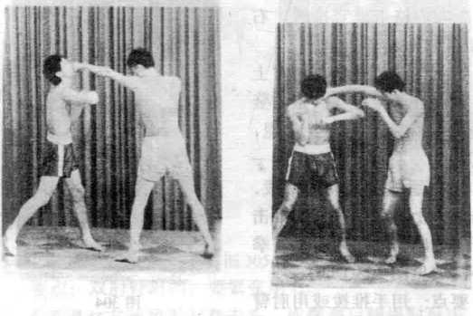对方夹颈卜,压用左或右膝上撞我头脸部或胸部我双手臂用力按压对方上撞的膝部。如对方用摆膝我即用推任同时头用力顶推对方下颌。使其后退不便施展膝撞