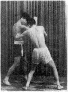 预势开始。对方步左刺拳右胸佯攻再进步用右平摆肘击我头颈部。我后滑步的同时出左直拳击头(见图301),或前左脚后撤一步用右直拳击头。