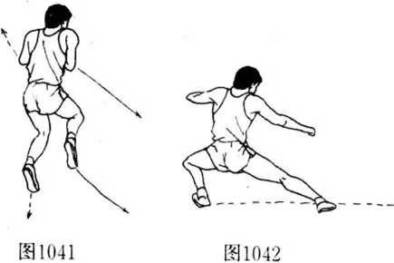 1041).然后左脚先落地,右脚向右侧地面挫脚,同时左手屈肘 向左横拉,右手向右下方摆去;目视右下方(图1042).