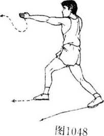 上动不停,左脚前迈,右脚向左后斜方滑进一小步,脚跟 提起。左手收回后变拳向前方摆击,拳眼向下,力达拳面。目 视左手(图1049).