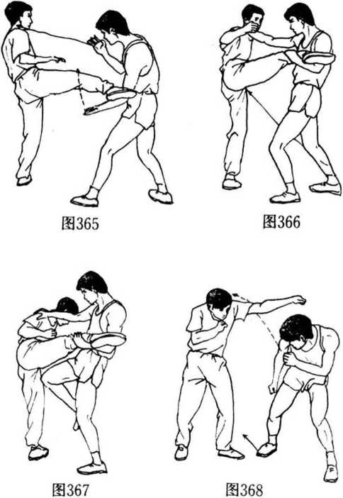 (1)搏击中,对方右边腿攻我中盘,我左手抄腿,右手屈肘 向左推挡(图365),左手上抄抱住对方右腿的同时,右手伸至 对方的右肩上(图366),左手抱腿上抬,右手向右下方抹按对 方右肩,右膝同时向前上方顶击对方裆部(图367)。