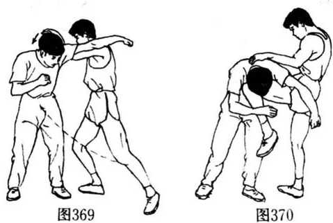 (2)搏击中,对方进步打我头面.我下潜并向外侧摇晃闪 至对方左臂外侧(图368,369),左手向左下方按压对方后颈 的同时,左腿屈膝猛顶对方腹、裆部,予以重创(图370).