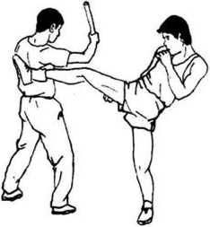 要领:侧闪时心理镇定,不可躲得过早,非得等到来棍离 自己很近时再躲,须知躲早了对方会及时变化方法,那样不切 实际。用外摆腿反击时向前推进速度必须很快。