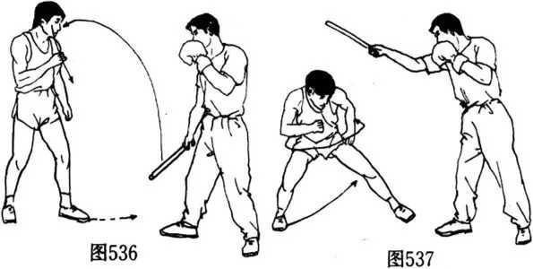 助手用短棍直捣我面门,拳手迅速侧闪躲开棍尖,随即后 脚垫步,以前脚外摆腿反击助手背部(图534、535)。